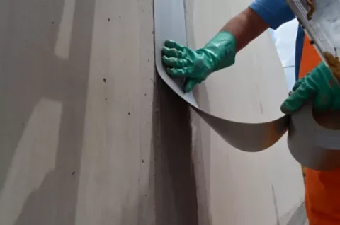 Das Abdichtungsband wird mit einem Spezialkleber auf den Bauteilflächen fixiert und bleibt dauerhaft elastisch, um Bewegungen im Untergrund sicher aufzunehmen.